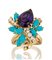 ANELLO. In oro giallo 18 kt montatura asimmetrica con ametista taglio goccia di cts. 7,00 ca. impreziosita da decori in pasta di turchese taglio navette cabochon e diamanti taglio brillante disposti a fantasia per tot. cts. 1,00 ca.