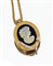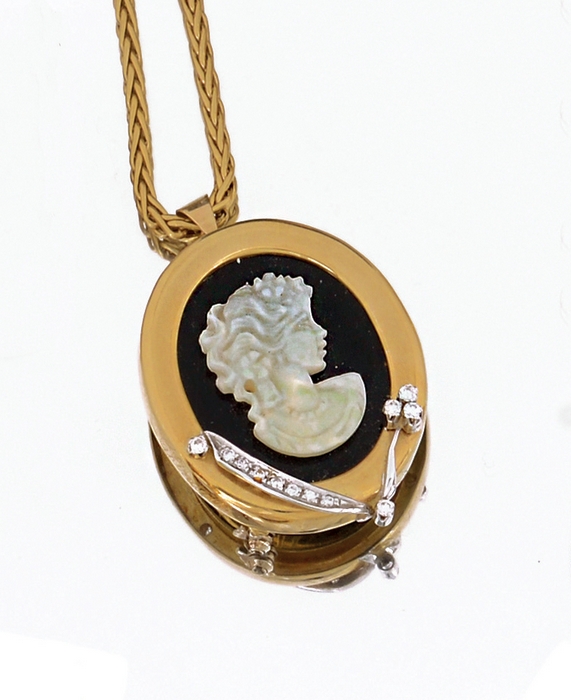 SPILLA CIONDOLO. In oro giallo 18 kt di forma ovalizzata centrato da settore in onice con opale inciso a profilo femminile applicato, decoro in diamanti taglio brillante per tot. cts. 0,25 ca., trattenuto da catena a maglia tubolare.