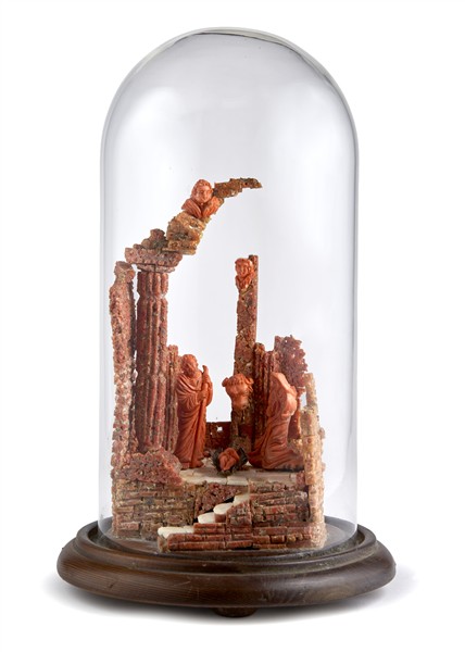 Nativity, composition in coral, bone, and other materials set among classical architectural ruins (42 × 20 cm). Under a glass dome (defects, breakages, and restorations).