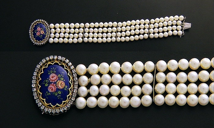 BRACCIALE ANNI '60 CA. A quattro fili di perle coltivate Giappone di mm 6 ca. con chiusura ovale in oro giallo e bianco 18 kt centrata da motivo in smalto policromo entro cornice in diamanti taglio rosa.