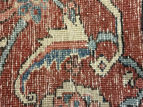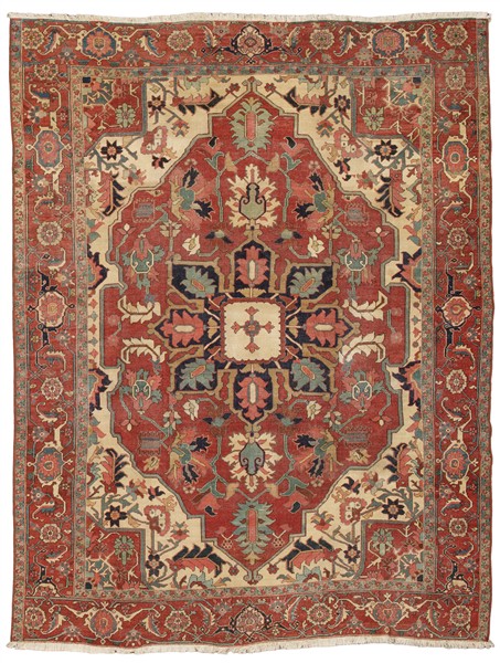 Tappeto Heritz, Persia, fine secolo XIX. Decoro con medaglione quadrato a fondo bianco polilobato con corona di fiori su fondo scuro a base verde. Campo a fondo rosso cosparso di rami fioriti stilizzati di grandi dimensioni. Angolari a fondo bianco. Bordura principale Herati a testuggine su fondo rosso (cm 354x270) (difetti, rapature e restauri)