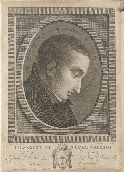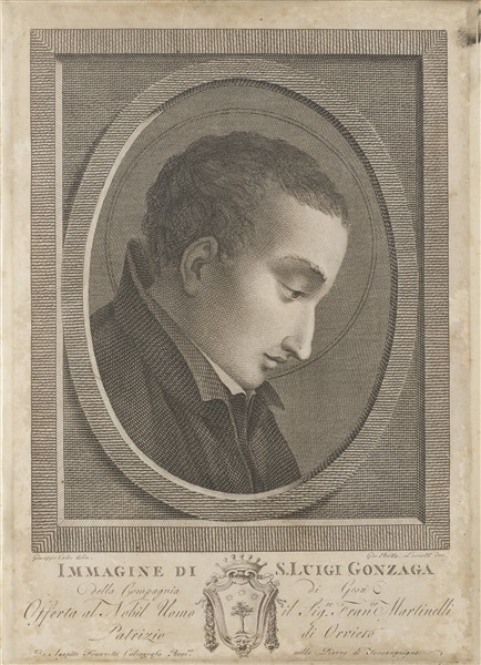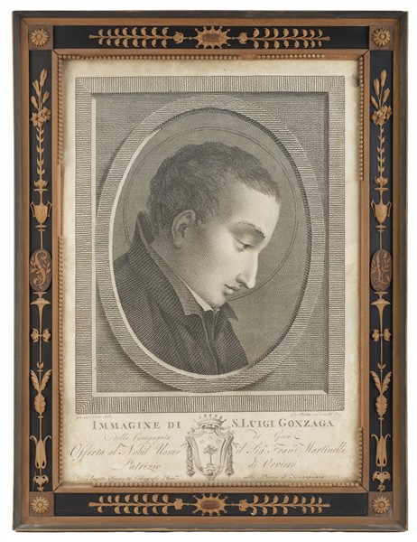 Cornice di forma rettangolare decorata nel profilo a microintagli con vasi biansati, rosoni ed elementi stilizzati e cifre SL entro ovali. Le cifre riprendono le iniziali del Santo Luigi Gonzaga ritratto di profilo nella stampa coeva di Giovanni Battista Leonetti (cm 36x28x2,5) (lievi difetti)