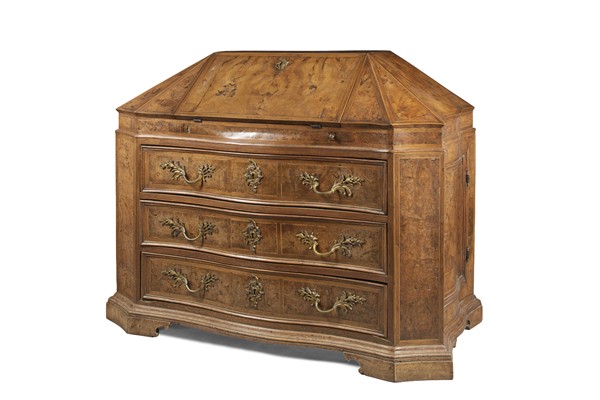 Ribalta a urna lastronata in noce e radica di noce filettata in legno chiaro, fronte mosso a tre cassetti e sportelli laterali, calatoia celante quattro tiretti e pianetto scorrevole, piedi a mensola. Veneto, secolo XVIII (cm 142x106,5x60) (mancanze e restauri)