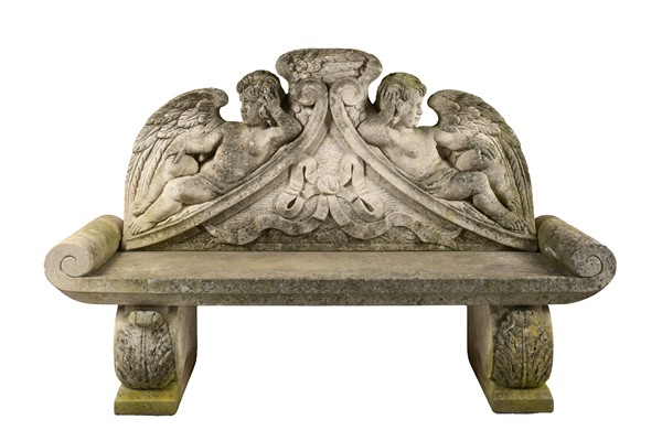 Carved stone bench with shaped backrest featuring two angels seated on a scroll and ribbon motif, seat with scroll armrests and double leafy scroll supports (187×122×60 cm) (defects)