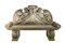 Panca da giardino in pietra scolpita con schienale sagomato a due angeli su volute e nastro, seduta con braccioli a ricciolo e doppio sostegno a voluta fogliata (cm 187x122x60) (difetti)