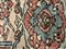 Tappeto Serapi, Nord ovest della Persia, secolo XIX. Decoro con medaglione strutturato in forma di grande granchio composto da cipressi-Boteh derivati dai motivi Safavidi. Fondo del medaglione rettangolare color verde acqua. Boteh a fondo rosa su campo color rosso scuro cosparso di rami fioriti e foglie. Bordura Herati su fondo bianco. Due decori molto singolari ai lati del medaglione sono riconducibili alla stilizzazione dei draghi di epoca arcaica (cm 347x293) (difetti, rapature e restauri)