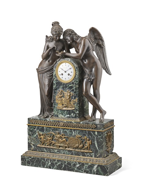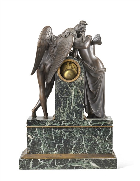A Verde Alpi marble and patinated bronze clock surmounted by the sculpture of Cupid and Psyche. White enamel dial with roman numerals, Breguet-type hands, two-train movement with hour chime and half-chime on bell. France, second quarter of the 19th century (h. cm 75) (defects)