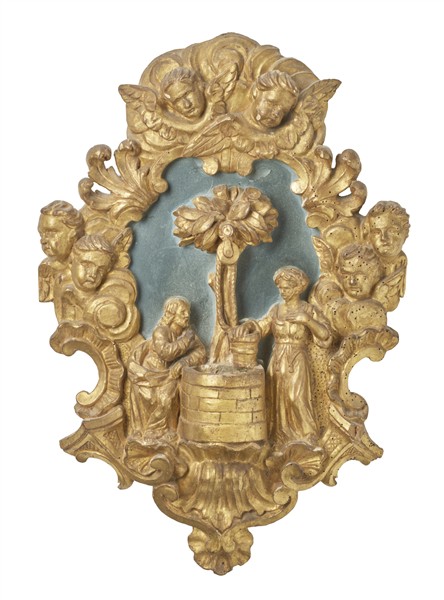 18th-century art. Carved and gilded wooden holy water font with a scene of the ‘Samaritan woman at the well’ on a mirrored background. Frame with cherubs and rocaille motifs (54.5x37 cm) (defects and missing parts)