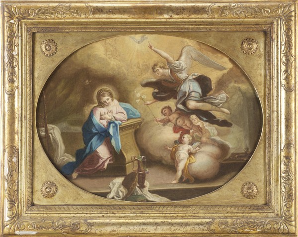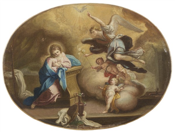 Coppia di dipinti ad olio su tela ovale raffiguranti "Visitazione" e "Annunciazione"