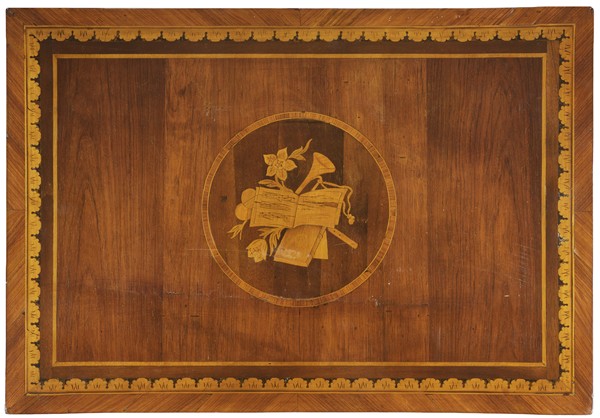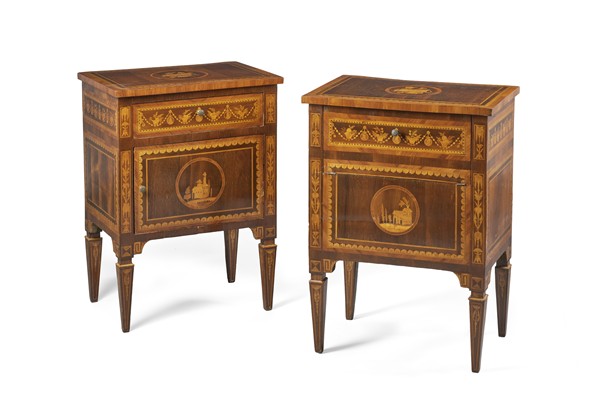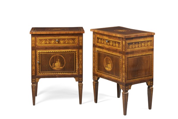 Due comodini lastronati in palissandro e intarsiati in legno chiaro di cui una con piano apribile, piani centrati da trionfi musicali entro filettature, fronte centrato da paesaggi, fasce con vasi di fiori tra ghirlande e busti maschili, gambe rastremate. Lombardia, inizio secolo XIX (cm 57x79x39,5; cm 57x78x39,5) (difetti)
