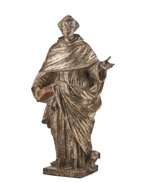 Carved wood, painted, gilded, and silvered. The Saint is depicted holding a book and accompanied by a dog, on a squared base (h. cm 132.5) (defects and restorations)
