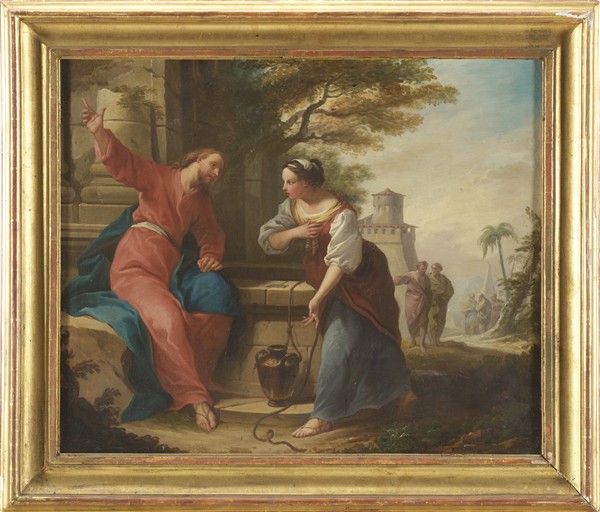 Maestro francese del secolo XVIII "Cristo e la Samaritana al pozzo" olio su te