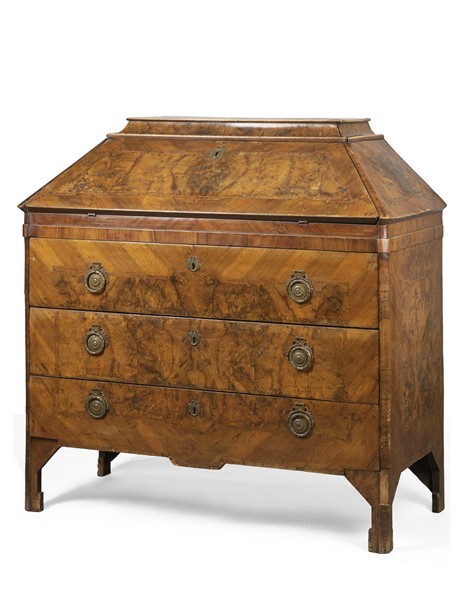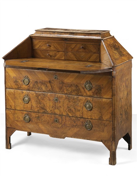 Ribalta a urna lastronata e filettata in noce e radica di noce, fronte a tre cassetti, la calatoia rivela quattro tiretti e alzata con cassettino, applicazioni in metallo, piedi sagomati. Lombardia, fine secolo XVIII (cm 121x120x52) (mancanze e restauri)