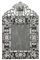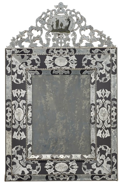 Grande specchiera rivestita in vetri sagomati in parte incisi su fondo in vetro blu con cornice rettangolare a doppio ordine e bordure a canne ritorte, cimasa sagomata e traforata centrata da specchio retro dipinto a scena pastorale. Venezia, secolo XIX (cm 189x119) (difetti e mancanze)