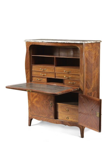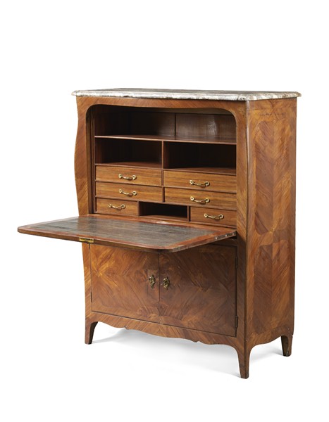 Secretaire di forma mossa lastronata in bois de violettes. Calatoia celante tiretti e scomparti, parte inferiore a due ante, quattro tiretti e vano a giorno. Piano sagomato in breccia. Reca stampigliatura sul montante destro sottopiano "J-L-F-DEL...ME". Francia, secolo XVIII (cm 113,5x134x42) (difetti e piccole mancanze)