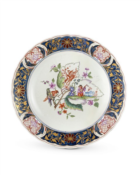 Manifattura di Claude Innocentius du Paquier, Vienna, 1725-1730 ca. Grande piatto in porcellana dipinta in policromia con foglie decorate a chinoiserie e volatili, tesa a volute fogliacee fiorite su fondo blu alternate a graticci, profili in oro (d. cm 34,5) (restauro)