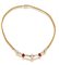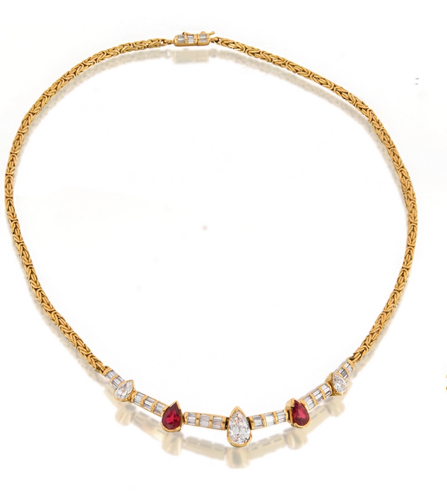 COLLANA. In oro giallo 18 kt a maglia tubolare con motivo centrale impreziosito da diamante taglio goccia di cts. 1,20 ca. (prob. colore I purezza SI) entro due rubini taglio goccia di cts. 2,00 ca. e due diamanti taglio goccia per tot. cts. 0,80 ca. (prob. colore I purezza VS) alternati da diamanti taglio baguette incastonati a binario per tot. cts. 1,40 ca.