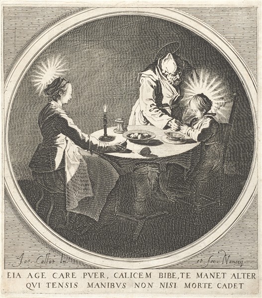 Jacques Callot "Le Bénédicité" acquaforte, III/IV (mm 190x167) firmata in lastra