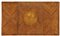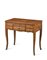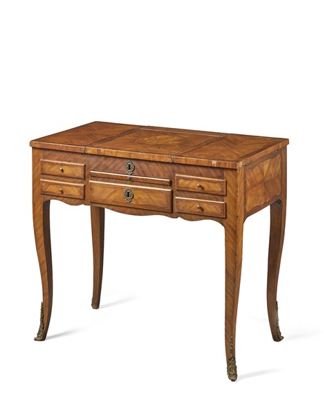 18th Century Central Dressing Table. Veneered in bois de rose and bois de violette with light wood inlays; central door decorated with medallion of leaves and flowers. Tripartite fold-over top concealing a mirror. Front with two small drawers and three false drawers, pull-out writing surface, metal mounts, and molded legs. (78 × 72 × 46 cm; with defects)