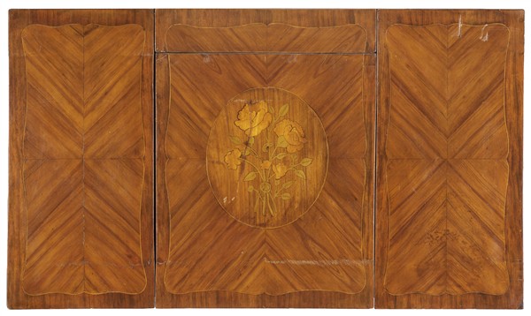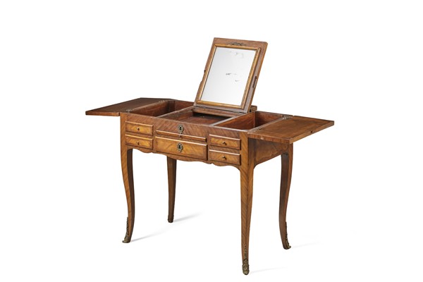 Toilette da centro lastronata in bois de rose e bois de violette e filettata in legno chiaro, anta centrata da medaglione con foglie e fiori, piano tripartito e ribaltabile celante specchio. Fronte a due tiretti e tre finti cassetti, piano estraibile, applicazioni in metallo, gambe mosse. Secolo XVIII (cm 78x72x46) (difetti)