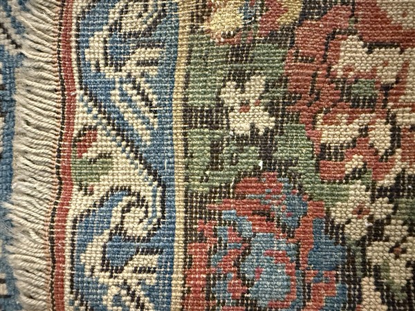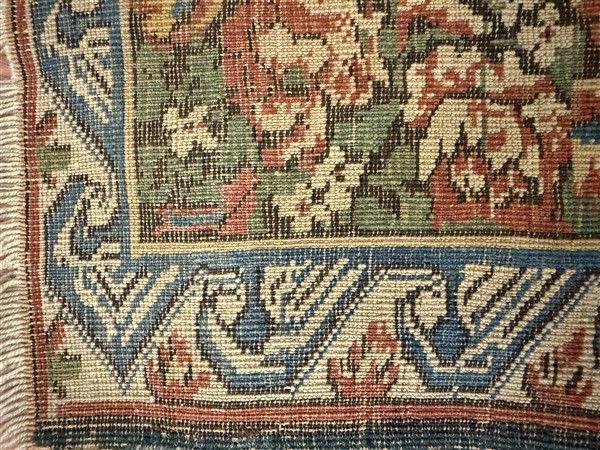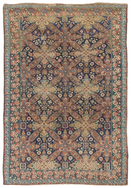 Tappeto Seichur, Caucaso, secolo XIX. Decoro con due file di croci di Sant'Andrea o motivo "a bastoni" in policromia su fondo blu notte. Bordura principale a fondo verde decorata con rose di ispirazione francese. Bordura esterna con motivo "cane che corre" su fondo bianco (cm 280x190) (difetti e rapature)