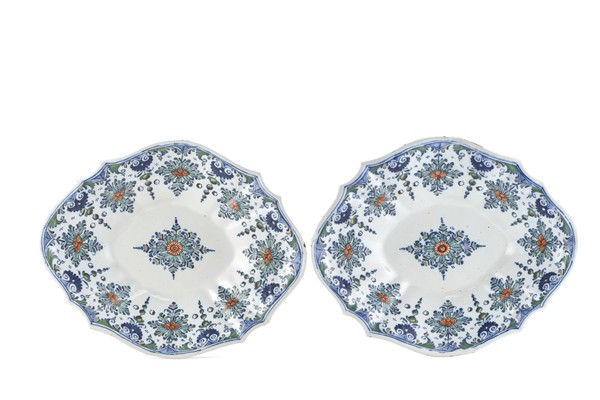 Pair of maiolica basins painted in polychrome in the Rouen style, with shaped rims, decorated with stylized floral motifs (cm 32x26). (Defects and chips)