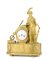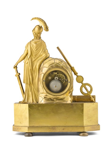 Pendola da appoggio in bronzo dorato con cassa a soggetto allegorico, quadrante in smalto bianco a numeri romani per le ore e arabi per i minuti, movimento a due treni con suoneria delle ore e mezza su campanello. Francia, 1830 circa (h. cm 45) (difetti e mancanze)