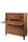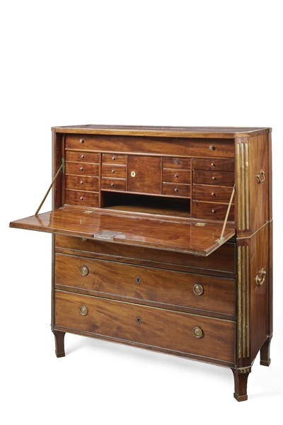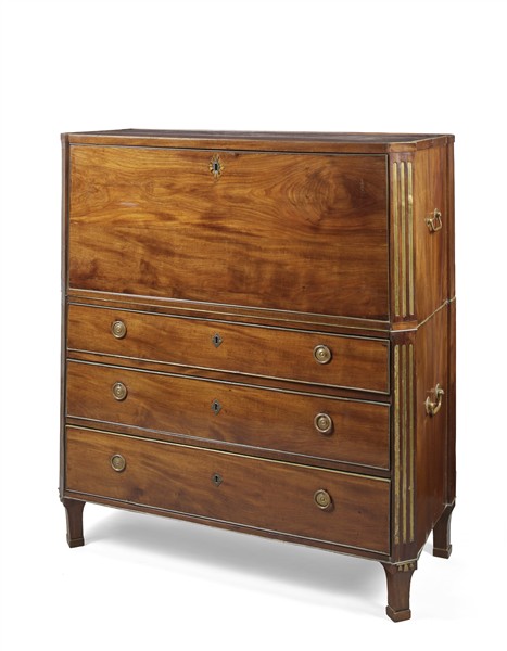 Mobile da campo a due corpi lastronato in mogano con fronte a tre cassetti e calatoia celante un cassetto sottopiano, sette tiretti, anta centrale e vano a giorno, montanti scanalati e dorati, prese laterali. Inghilterra, secolo XIX (cm 113x126,5x49) (difetti)