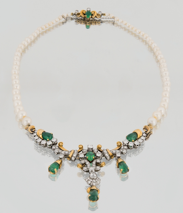 COLLANA ANNI '40 CA. In oro bianco e giallo 18 kt ad un filo di perle coltivate Giappone disposte a scalare di mm 7/4 ca. con motivo centrale realizzato a volute terminanti a ricciolo impreziosito da diamanti taglio vecchio, brillante e huit-huit per tot. cts. 4,00 ca. entro profili milligranati, smeraldi taglio goccia cabochon per tot. cts. 10,00 ca.