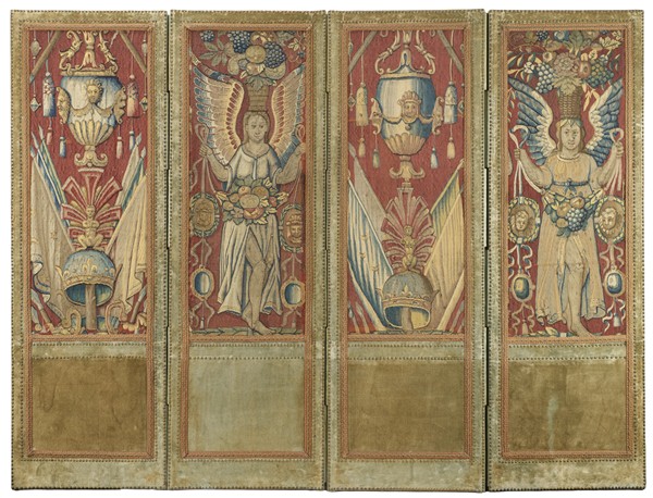 Paravento a quattro ante composto da quattro frammenti dalla bordura di un grande arazzo Aubusson, Fiandre, secolo XVI. Due alternati sono decorati da allegorie ad ali spiegate che con le braccia aperte reggono nastri riuniti da ghirlande di frutta e fiori e due tableau con volti di cherubini con sottostanti due specchi. Sul capo reca canestro con trionfo di frutta, fiori e volatili. I restanti due teli sono decorati da trionfo di armi formato da alabarde con stendardi che fanno da sfondo ad una corona blu azzurra decorata con gigli di Francia sopra la quale spunta una metopa con sfinge assisa. Nella parte superiore pende un vaso azzurro decorato con bassorilievi di mascheroni e baccellature. Fondo color rosso rubino. Il paravento di epoca posteriore rivestito in velluto verde borchiato (cm 237x179) (difetti e restauri)