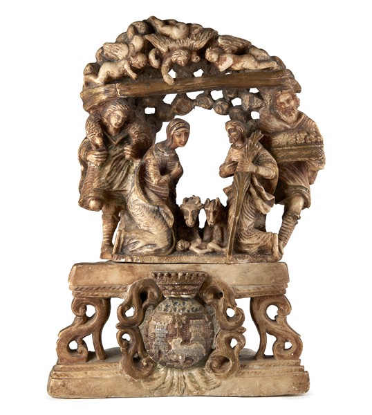 “The Adoration of the Shepherds,” sculptural group in alabaster with traces of polychromy (overall 28 × 43 cm) (defects and restorations).