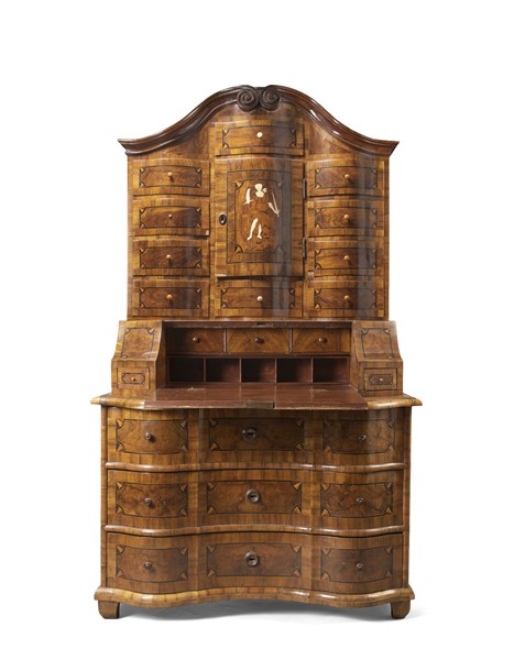 Trumeau, 18th century. Bombe-shaped walnut and walnut burl veneered, with inlays in various woods. Upper section with ten drawers and central door decorated with an inlaid figure of Justice in bone; volute-crowned cornice. Lower section with three drawers beneath a central compartment adorned with allegorical bone inlays, shaped feet. (116 × 198 × 68 cm) (losses, replacements, and restorations).