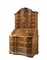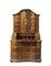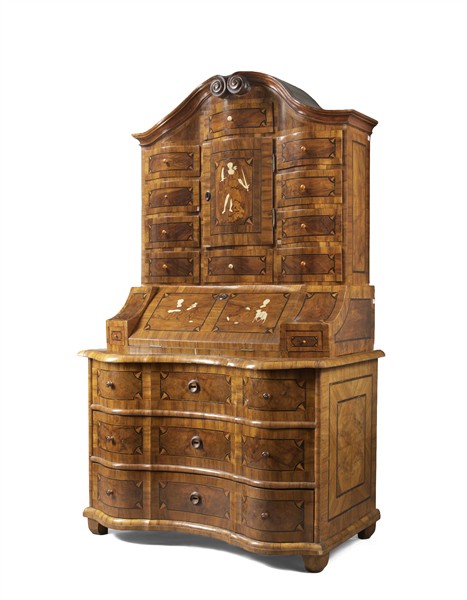 Trumeau di forma mossa lastronato in noce e radica di noce e filettato in legni vari. Parte superiore a dieci tiretti ed anta centrale decorata con la figura della Giustizia intarsiata in osso, cimasa a volute contrapposte; parte inferiore a tre cassetti sotto calatoia centrata da figure allegoriche intarsiate in osso, piedi sagomati. Secolo XVIII (cm 116x198x68) (mancanze, sostituzioni e restauri)