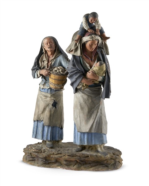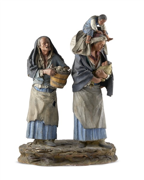 Bottega dei Bongiovanni Vaccaro, Caltagirone, secolo XIX. "Figure femminili con bambini", gruppo scultoreo in terracotta dipinta in policromia (cm 25x36) (difetti e mancanze)