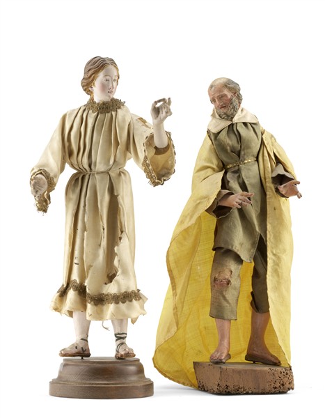Neapolitan art, 18th-19th century. "Two nativity figures" in polychrome terracotta, glass paste eyes, textiles embroidered and other materials. Mounted on a later wooden base (h. max cm 35,5) (defects and losses)