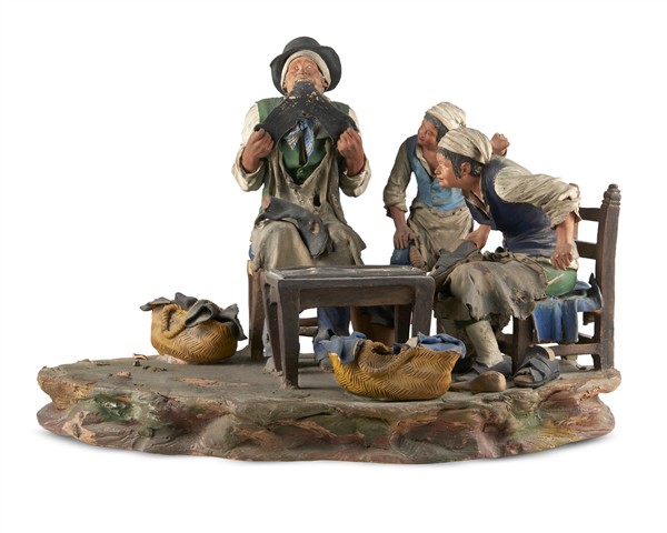 “At the Cobbler’s,” Nativity group in painted polychrome terracotta (40 × 28 cm) (defects and losses).