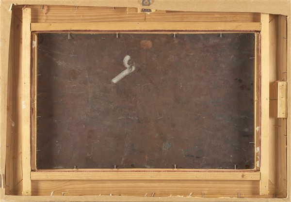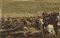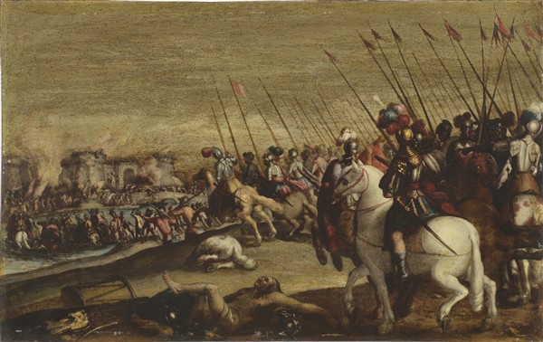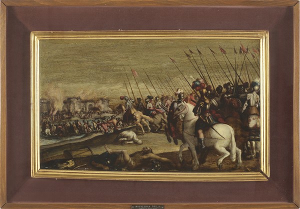 Maestro del secolo XVII "Scena di battaglia con castello sullo sfondo" olio su