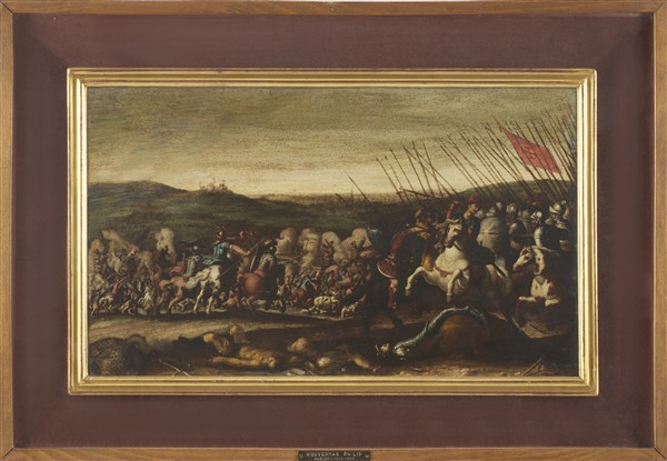 Maestro del secolo XVII "Scena di battaglia con cavaliere moro" olio su rame (