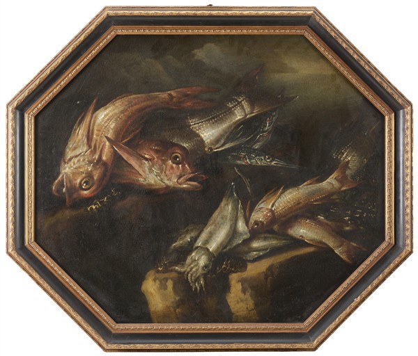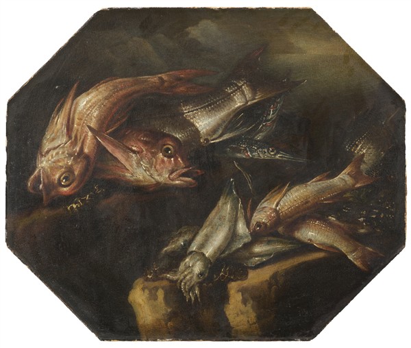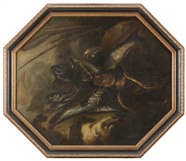 Pair of oil paintings on octagonal canvas depicting "Still lifes with fish, squid, turtle and fishing tools"