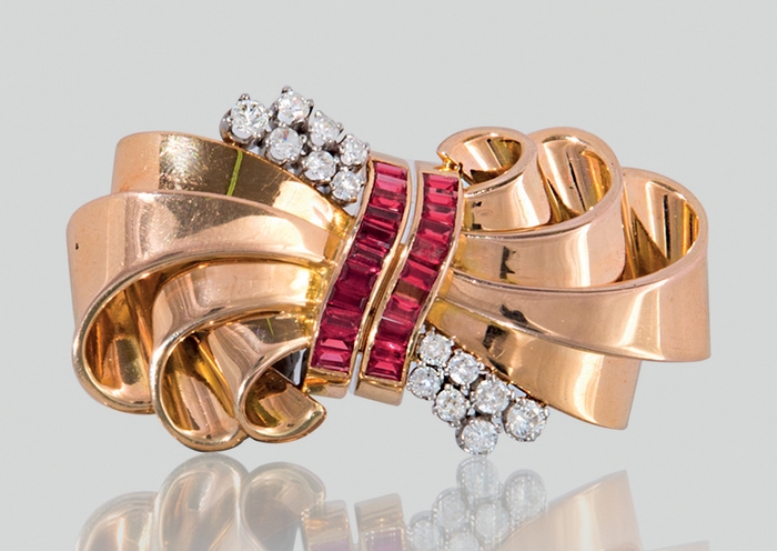 SPILLA DOPPIA CLIP ANNI '40 CA. In oro rosa e bianco 18 kt realizzata a fiocco nastrato con decoro centrale in rubini sintetici taglio baguette incastonati a binario impreziosita da motivi in diamanti taglio vecchio per tot. cts. 1,50 ca., chiusure a doppio ago e ad ago semplice.