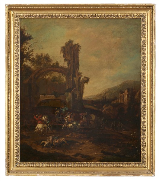 Maestro del secolo XVII "Paesaggio con battaglia di cavalleria presso delle ro
