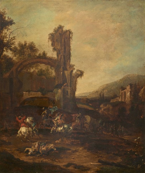 "Paesaggio con battaglia di cavalleria presso delle rovine"
