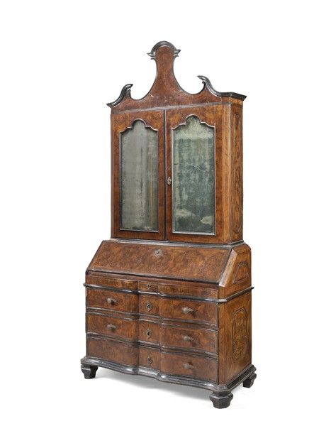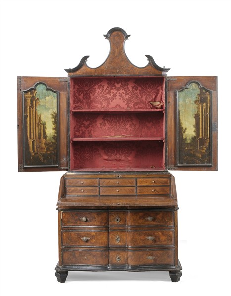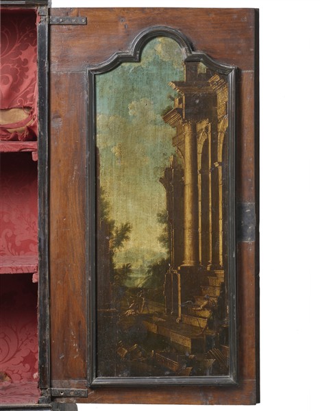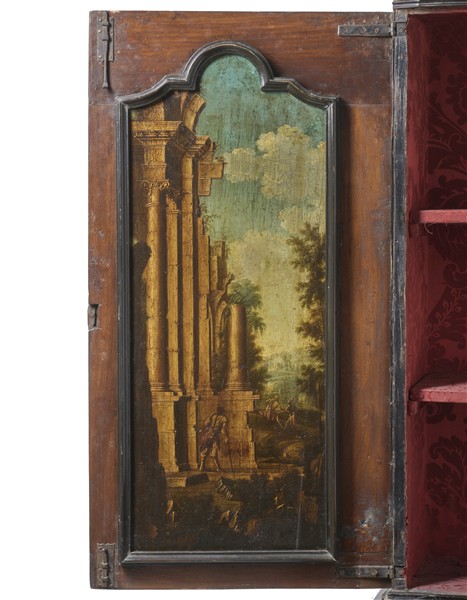 Trumeau lastronato in noce e radica di noce, filettato in legni chiari con profili ebanizzati. Parte superiore a due ante specchiate e interno con pannellature dipinte a paesaggio con ruderi, cimasa di linea spezzata. Parte inferiore a tre cassetti sotto uno a mezza lunghezza e calatoia che rivela sei tiretti. Lombardia, secolo XVIII (cm 116x245x56) (restauri, sostituzioni, le due parti non pertinenti)