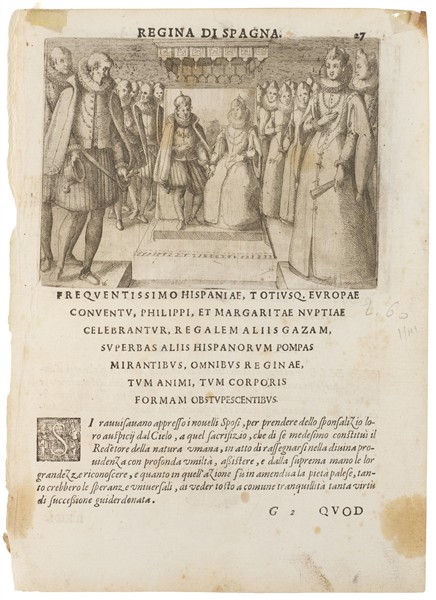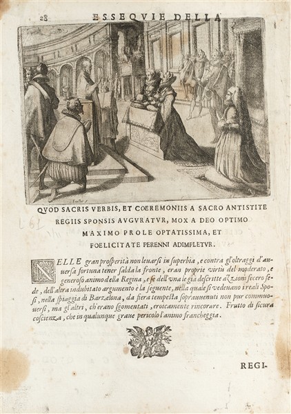 "The Meeting of the Archduchess with Philip III" (recto; 130x175 mm) and "The Marriage of the Queen of Spain" (verso; 129x178 mm), from the work "Requiem of the Queen of Spain" (Florence 1612)