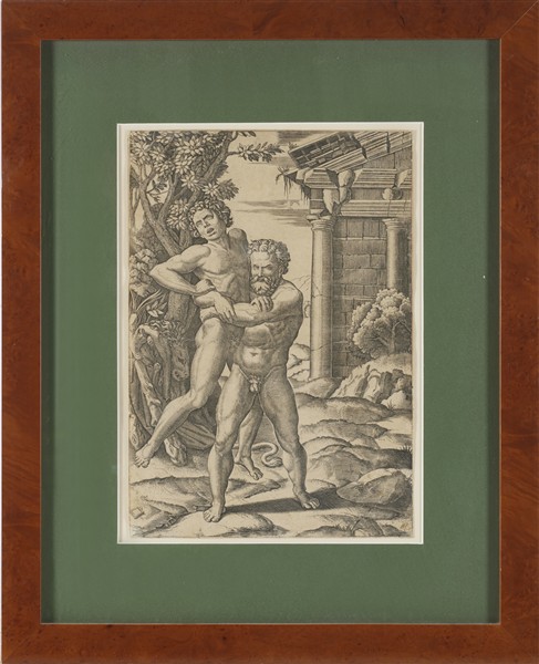 Marcantonio Raimondi "Ercole e Anteo" bulino (il foglio mm 305x213) filigrana "O