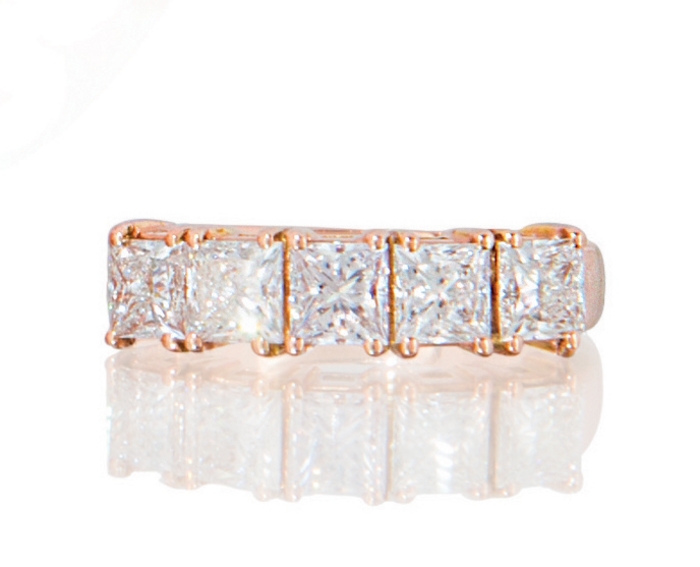 ANELLO. In oro rosè 18 kt con cinque diamanti taglio princess disposti a rivière per tot. cts. 2,00 ca. (prob. colore G/H purezza VVS) entro castoni a quattro griffes.