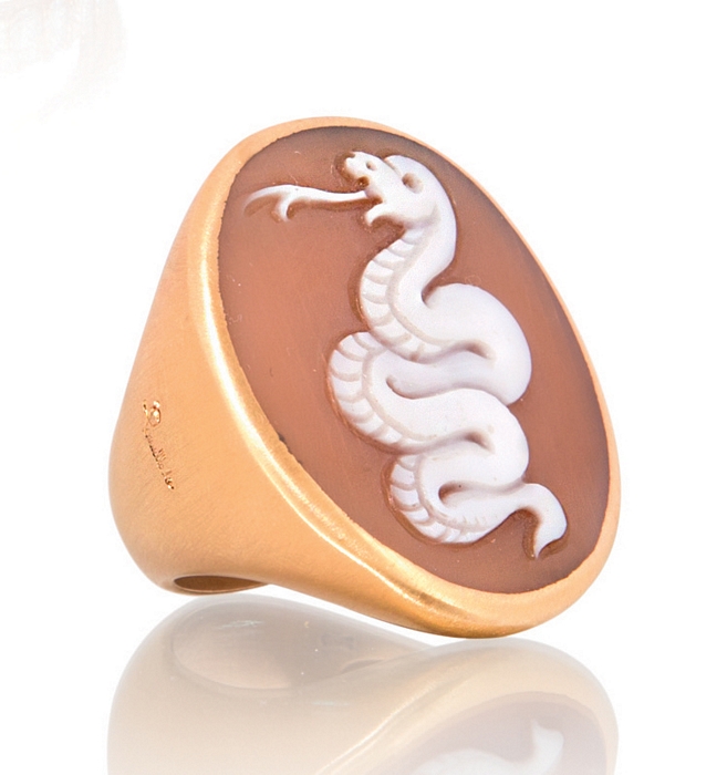 ANELLO DI POMELLATO. In oro rosa 18 kt montatura satinata, al centro cammeo ovale con serpente scolpito in altorilievo, gioiello numerato completo di astuccio e certificato in bianco originali.
