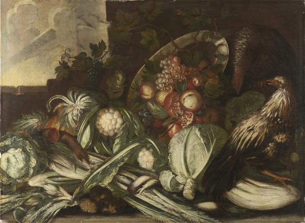 "Composizione con ortaggi, piatto di frutti e uccelli da aia"
