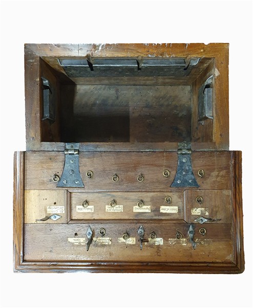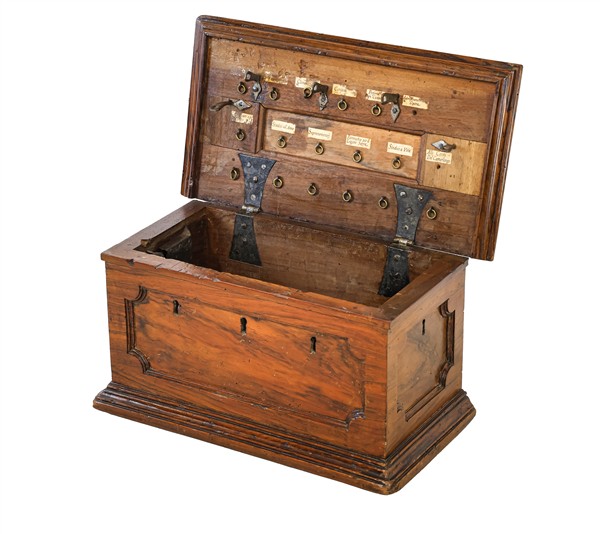 An 18th-19th century small carved walnut archive chest. The lid reveals handwritten paper labels indicating the categories of keys to be hung on the metal hooks positioned below. The exterior is panelled and fitted with five locks (54×28×27 cm) (defects and missing keys).