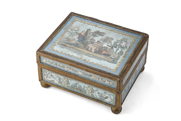 Scatola portagioie con miniature in carta applicate su vetro, interno con specchio e nove scomparti, con segreto che ne rivela uno ulteriore, piedini a sfera. Francia, secolo XIX (cm 19x10x16) (difetti)